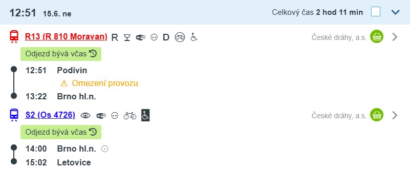Dobu do odjezdu vlaku můžete v Podivíně strávit v nádražním bufetu, v nedaleké pizzerii či restauraci. Vlak R13 odjíždí ve 12:51 hodin z nádraží Podivín do Brna. V Brně vlak S2 odjíždí ve 14 hodin. Příjezd do Letovic v 15:02 hodin. Zde si můžete převzít kola a zavazadla. Nákladní auto pak popojede do Šebetova, kde se zbytkem zavazadel bude čekat u hasičské zbrojnice.