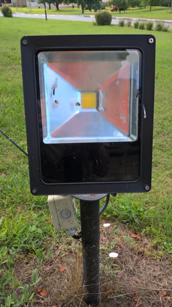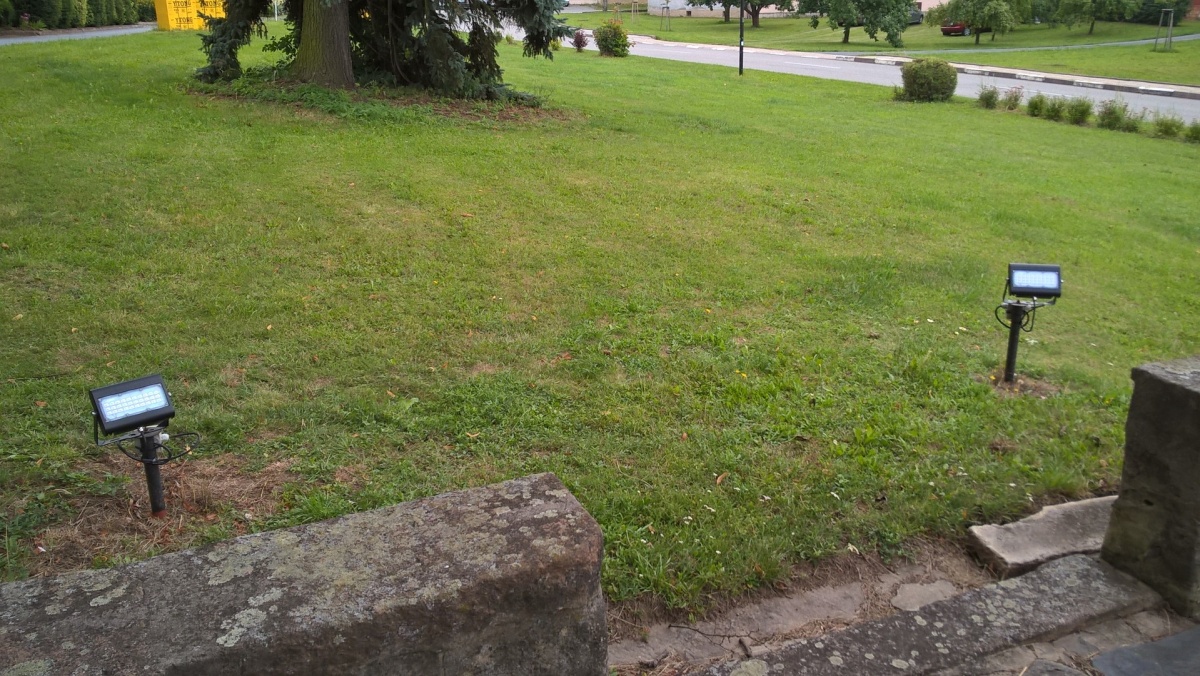Původní halogenové nasvícení sochy bylo v listopadu 2013 nahrazeno novými LED reflektory. Začátkem roku 2016 bylo první světlo porouchané, koncem června se porouchalo i druhé. Svítidla tohoto typu se již kvůli poruchovosti a krátké životnosti pouze doprodávají. Namontoval jsem tedy novou generaci poloprofi LED reflektorů se sofistikovanějším chlazením a především děleným značkovým SMD čipem PHILIPS. Udávaná životnost je 50 000 hodin, výkon každého je 50 W.