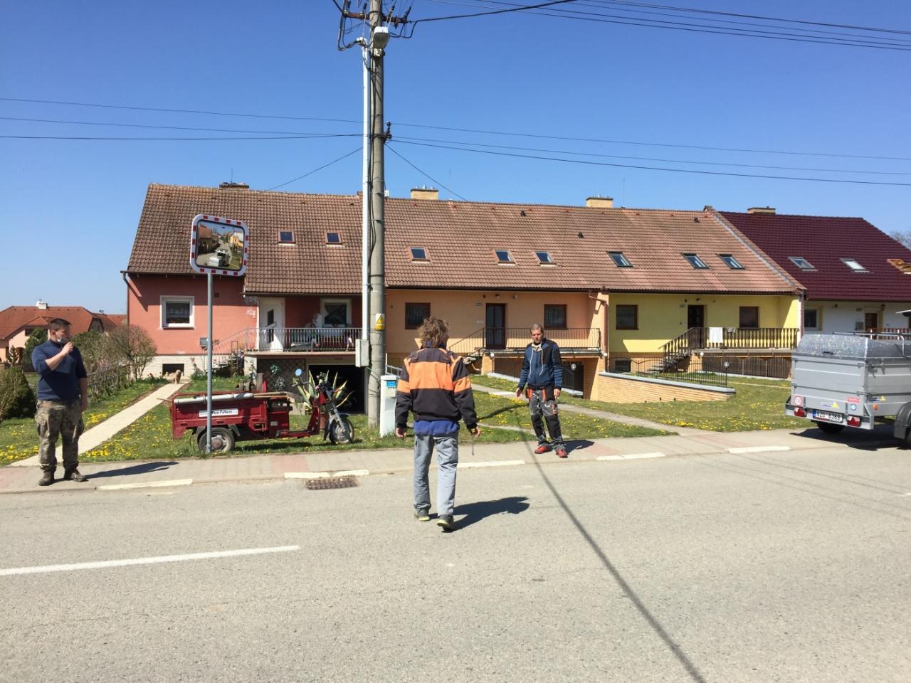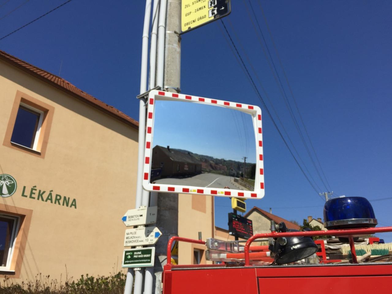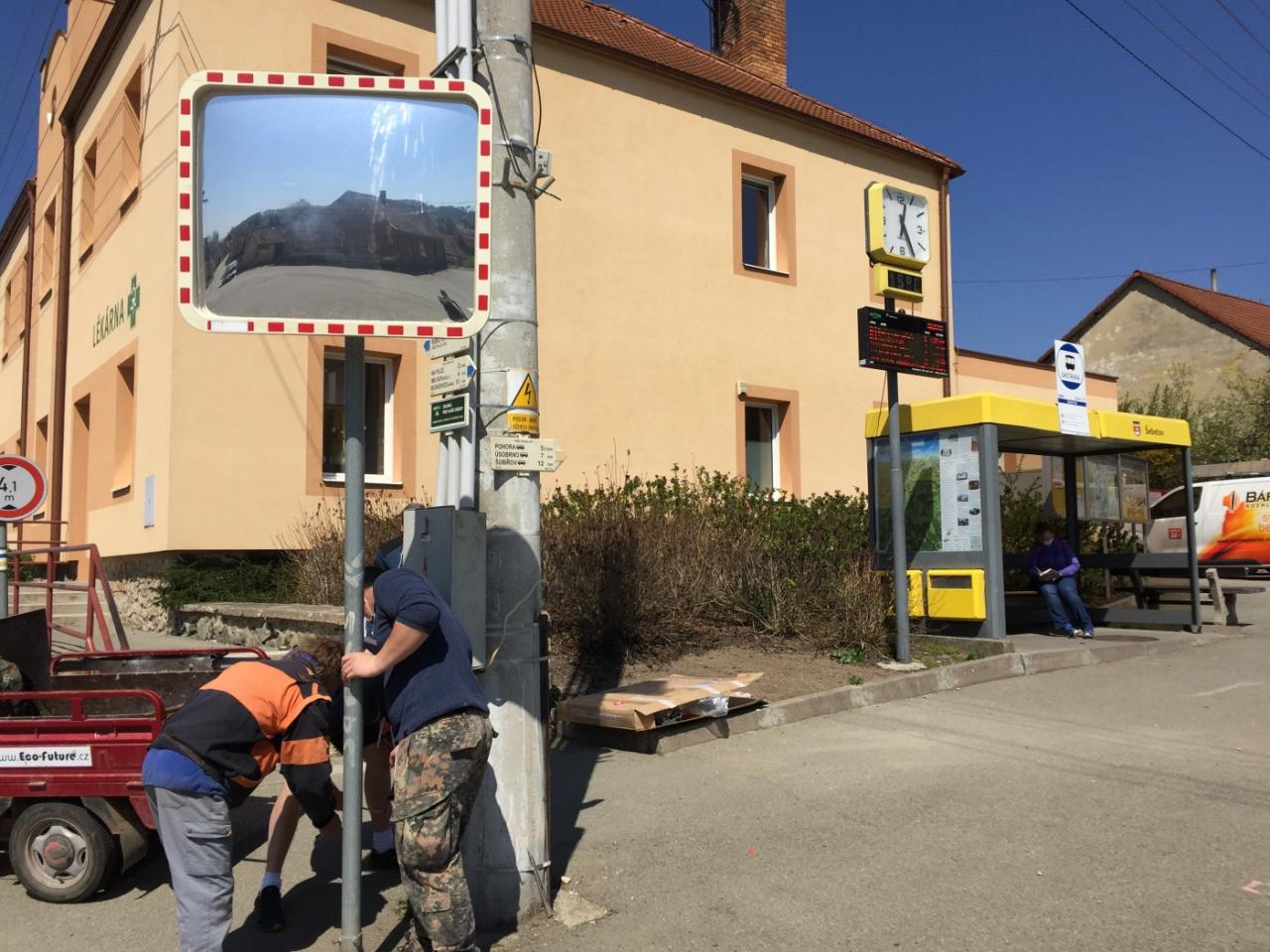 Instalace nových a větších dopravních zrcadel ze dne 21. dubna 2020. Zrcadlo na hlavní křižovatce je nyní na držáku přímo na sloupu a je elektricky vyhřívané pro zamezení orosení či námrazy.