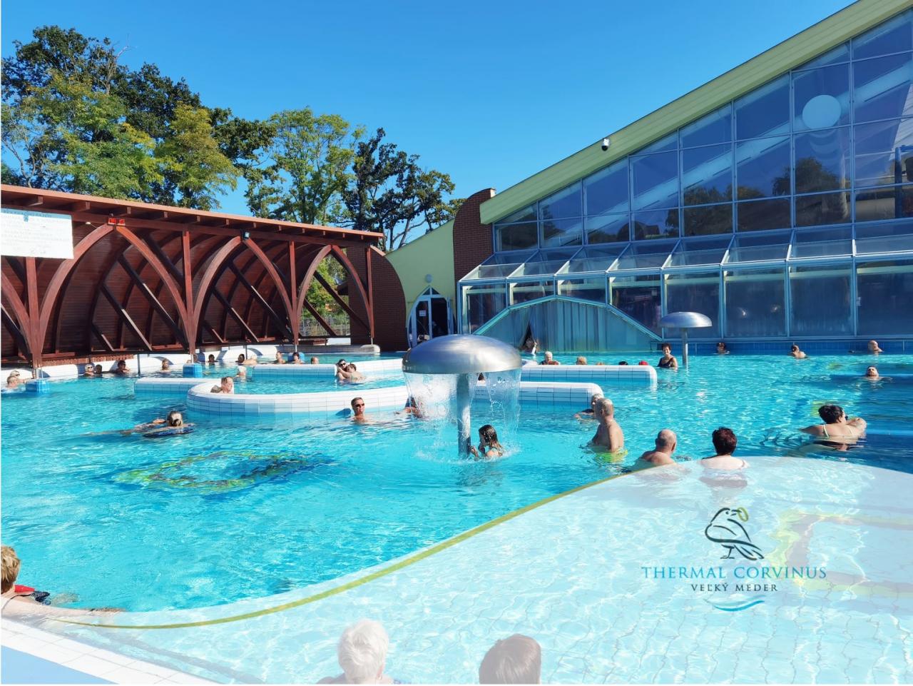 Thermal Corvinus nabízí celkem 13 bazénů s blahodárnou termální vodou na ploše 10 hektarů, monumentální tobogány a impozantní vlnový bazén, adrenalinový skokanský bazén, příjemně unášejícící divokou řeku, vitální saunový svět a mnoho dalších zážitků pro tělo i duši.