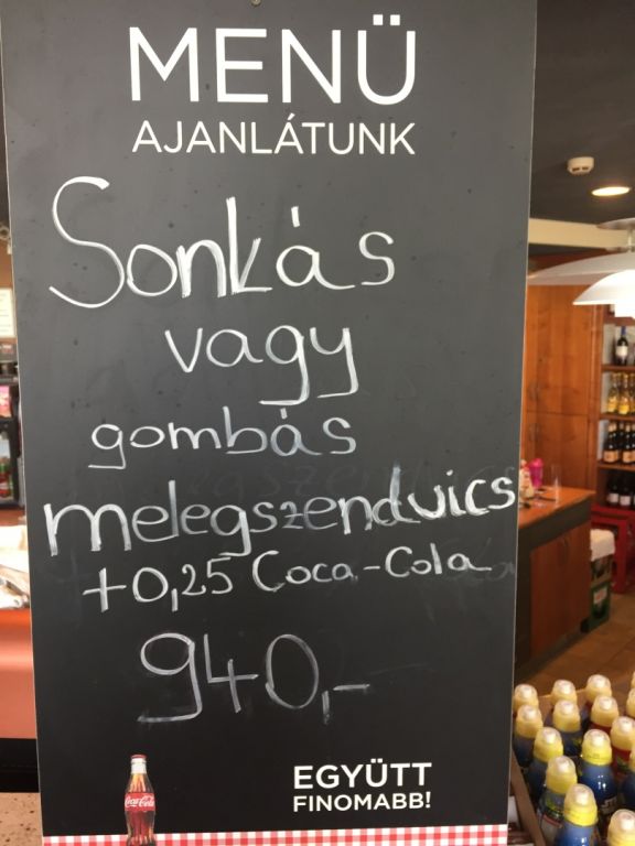 Nejlevnější občerstvení je u dřevěného stánku na venkovním prostranství. Tento však možná ještě nebude otevřený /v sobotu 5. května 2018 byl ještě zavřený/. Nejoblíbenější levnou svačinou je u vodního baru velká bageta se zapečeným sýrem a šunkou nebo houbami. Včetně nápoje stojí jen 950 HUF. Hodně jídla za málo peněz... Podívejte se na konci fotogalerie. Tam jsou i ceníky a popisky.