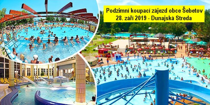 V sobotu 28. září si Vás dovolujeme pozvat na další obecní koupací zájezd. Thermalpark Dunajská Streda je jedno z nejoblíbenějších a nejnavštěvovanějších rekreačních středisek jižního Slovenska. V krásném prostředí v srdci Žitného Ostrova nabízí kvalitní služby a dokonalou relaxaci pro všechny věkové kategorie. Thermalpark vděčí za svou existenci šťastné náhodě: začátkem 80. let, kdy na území nynějšího koupaliště navrtali místo ropy v hloubce 1.600 metrů mineralizovanou vodu s teplotou 57 °C, začala v životě Žitného Ostrova nová kapitola. Na ploše 18 hektarů se momentálně nachází 10 vnitřních a vnějších bazénů s mineralizovanou léčivou a termální vodou s teplotou od 26 °C do 39 °C, která má příznivé účinky hlavně při potížích s pohybovým ústrojím.